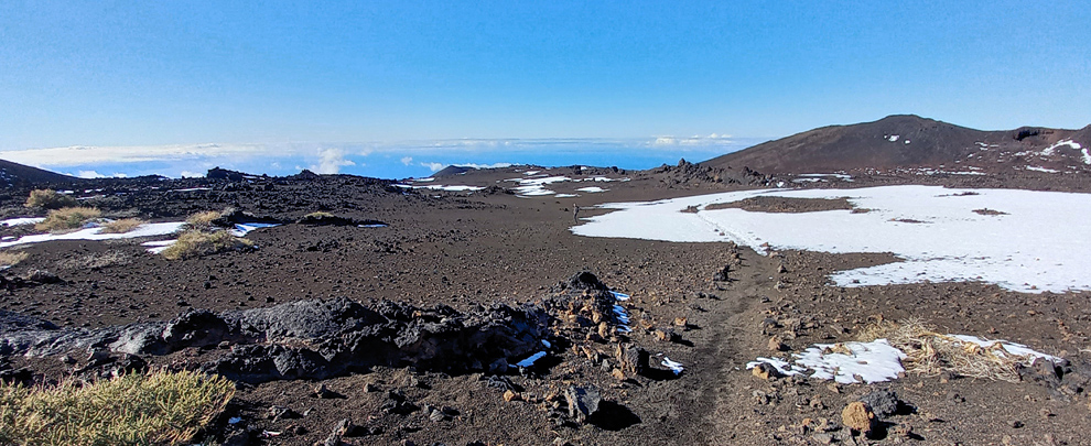Le parc national du Teide était partiellement fermé en raison de chutes de neige récentes. Le sommet, enneigé sur toute sa hauteur, contrastait fortement avec les étendues de laves sombres qui couvrent les flancs du volcan. Les températures fraiches et l'humidité ambiante rappelaient que l'hiver canarien peut aussi se montrer rigoureux en altitude.