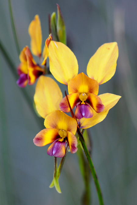 Diuris brumalis (Winter donkey orchid) est la première espèce du genre à fleurir durant l'hiver (de fin juin à août). Nous l'avons rencontré dans la région de Wongan Hills mais elle est assez largement répandue dans cette région du sud-ouest australien. La forme des fleurs est peu variable d'une espèce à l'autre, de teinte jaune avec des nuances plus ou moins prononcées de violet et marron, un sépale dorsal large surmontant un labelle trilobé, deux sépales latéraux fins et verdâtres et enfin deux importants pétales latéraux dressés en forme d'oreilles d'âne, signe commun à ce groupe des "Donkey orchids".