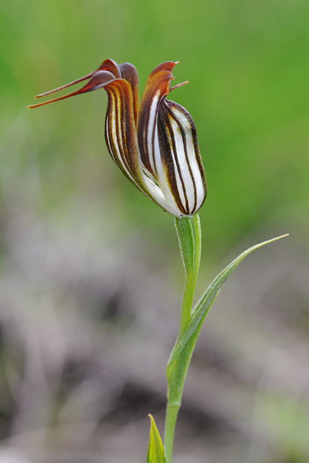 Pterostylis recurva est une orchidée très commune que nous rencontrerons également tout au long du séjour. Son nom local est Jug Orchid en raison de la forme en urne de ses fleurs. Sa taille varie de 30 à 90 cm avec une inflorescence composée généralement de 2 à 4 fleurs. Elle affectionne les zones boisées et les sols peu profonds des affleurements granitiques. Comme indiqué plus haut, la caractéristique commune au genre Pterostylis est la couleur verte des fleurs avec des rayures blanches et parfois brunes, et une fleur fermée laissant plus ou moins apparaitre le labelle.