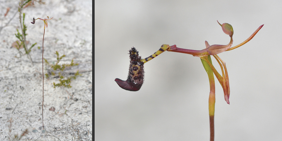 Nous avons eu l'occasion de voir quelques individus de l'espèce Drakea livida (Wharty hammer orchid) qui pousse sur sol sablonneux.