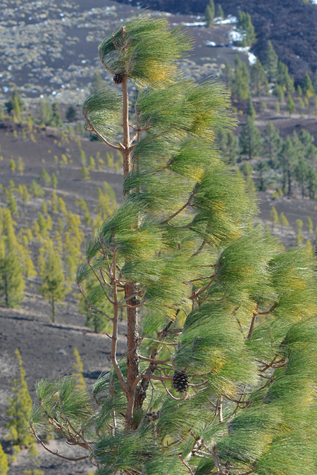 La flore de l'île a développé une remarquable capacité d'adaptation. Le pin canarien (Pinus canariensis) qui est présent sur les flancs du mont Teide, à une altitude comprise entre 1000 et 2000 m, survit aux incendies grâce son écorce, écailleuse, épaisse et très résineuse, qui lui confère une grande résistance au feu. Seules les couches externes sont brûlées, ce qui permet une récupération complète en quelques années. Le pin canarien possède une autre caractéristique remarquable : grâce à ses longues et fines aiguilles, il capte l'humidité apportée par les brumes qui se forment dans cette partie de l'île. Le parc de la Corona Forestal, qui entoure Las Cañadas del Teide, ou la Montaña de la Cruz de Tea comptent parmi les sites qui abritent les plus belles pinèdes de cette espèce singulière.